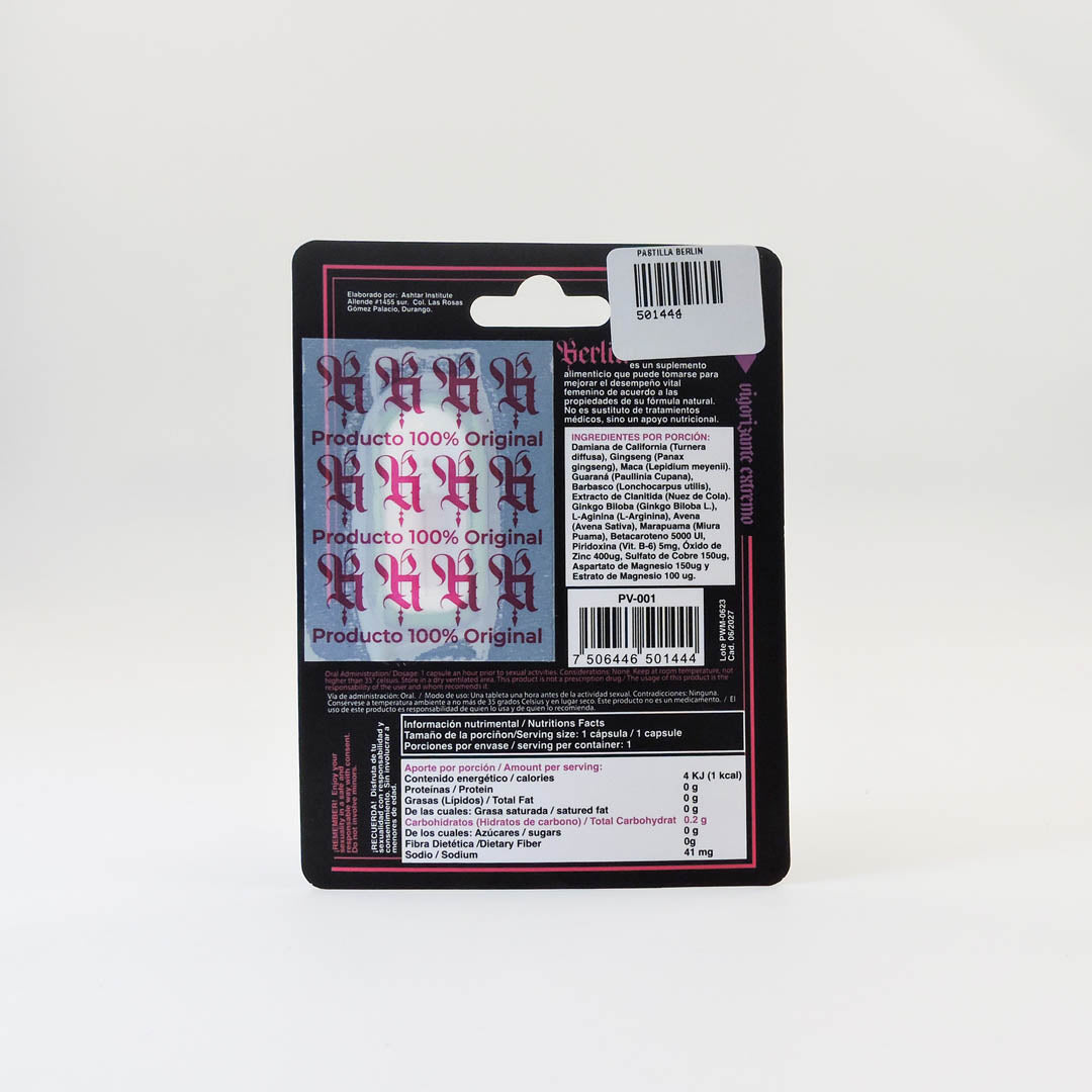 El suplemento Berlin 72 Horas de Poder está diseñado como una pastilla vigorizante natural para mujeres, promoviendo un aumento en la vitalidad y el rendimiento durante periodos íntimos con efectos que duran hasta 72 horas.